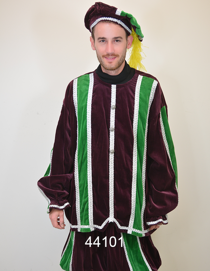 Deze door ons zelf geproduceerde pieten kostuums zijn gemaakt van de echte Niedeck kledingfluweel met de gouden draad, en rijkelijk versiert met goud galon.