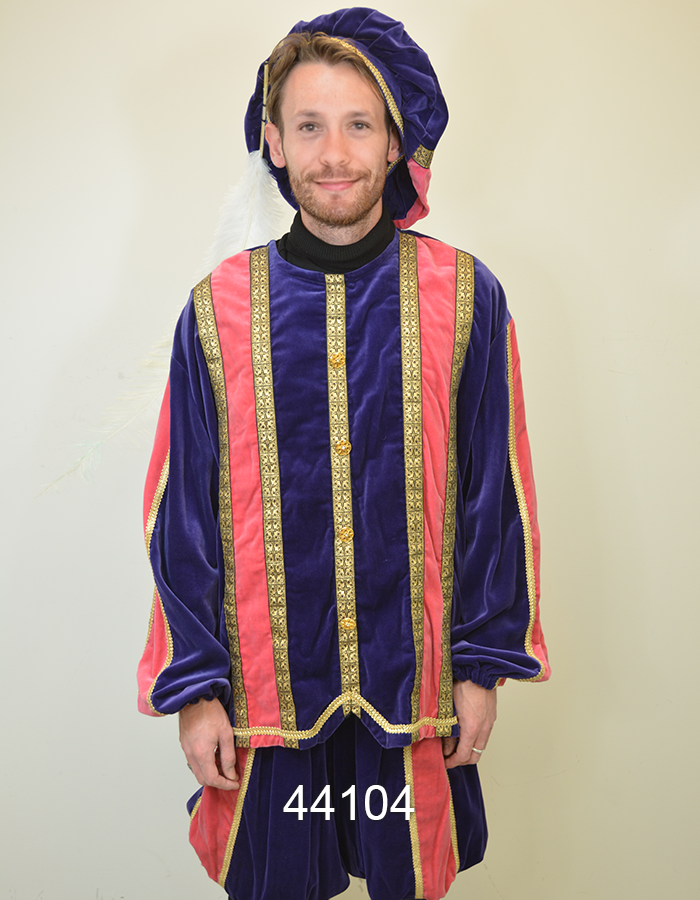 Deze door ons zelf geproduceerde pieten kostuums zijn gemaakt van de echte Niedeck kledingfluweel met de gouden draad, en rijkelijk versiert met goud galon.
